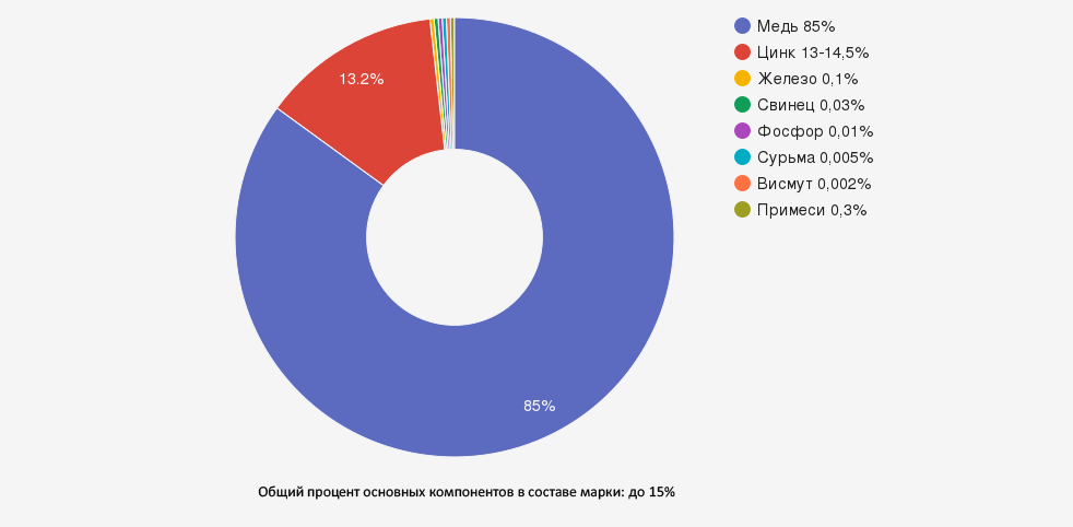 | Медь (Cu) | 84,0-86,0 | Определяет основные характеристики сплава: пластичность, коррозионную стойкость, теплопроводность и электропроводность |